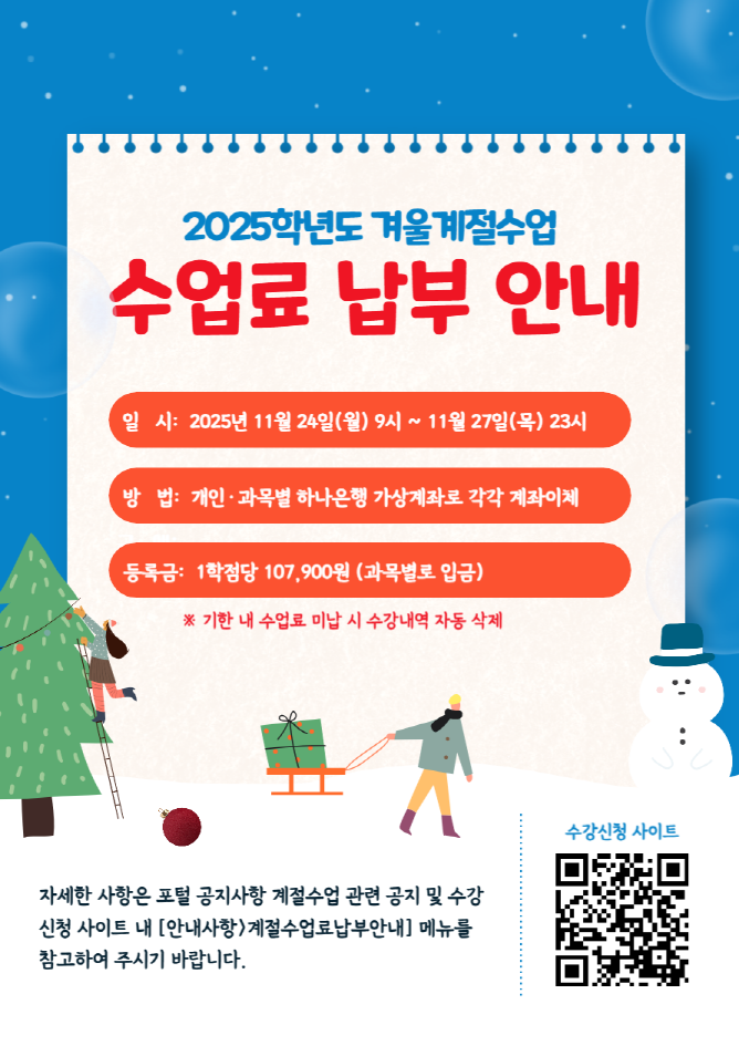 | 수업료 납부 | 11월 24일(월) 09:00 ~ 11월 27일(목) 23:00 | 하나은행가상계좌 이체*과목별로 가상계좌 배정되므로,여러 과목 신청 시 각각 입금 |
