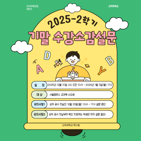 2025학년도 2학기 기말 수강소감설문을 다음과 같이 실시하오니 학부생 여러분의 많은 협조를 부탁드립니다.