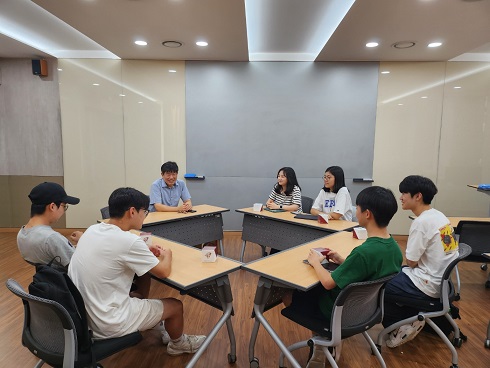 2023년 8월 14일 전라북도 전주에 위치한 상산고등학교 1학년 학생 6명이 수학과를 방문하였습니다. 학생들을 맞아 권택연 세미나실에서 학과장이 우리 학과에 대한 소개와 함께, 고등학교 때와는 다른 대학교에서의 수학, 특히 수학적 모델링을 여러 사례들을 들어 설명하였습니다. 학생들도 수학과 졸업 후 진로, 수학 연구에 대한 경험, 학생들이 읽을만한 교양서적 등에 대해 질문들을 하였습니다.