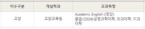 중급반을 수강신청하는 경우 아래의 그림과 같이 교과목명에 "이과대학" 이라고 쓰여 있는 분반으로 수강신청 하시기 바랍니다.