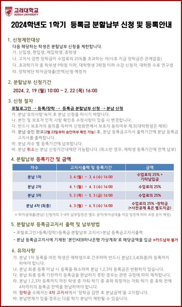 [공통] 2024년 1학기 대학(원) 등록금 분할납부 신청 및 등록 안내