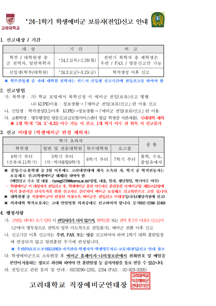 [공통] 24-1학기 학생예비군 보류자(전입)신고 안내