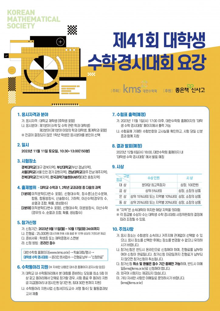 2023년 제41회 대학생 수학 경시대회(대수경)는 2023년 11월 11일(토)에 개최될 예정입니다. 자세한 요강 및 안내사항은 대한수학회 홈페이지(https://www.kms.or.kr/) 공지사항을 통해 추후 공지될 예정입니다. 대략적인 출제범위는 다음과 같습니다. 자세한 내용은 9월초에 공지되는 요강을 참고하기 바랍니다.
